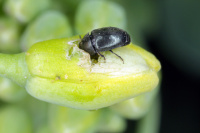 Brouk: 1,5–2,5 mm dlouhý, oválný, černý se zeleně až modravě lesklými zády. Larva: 3,5–4 mm dlouhá, nažloutle bílá, s řídkými sety na těle, černohnědá hlava, 3 páry krátkých černohnědých nohou, na horní straně každého segmentu 2–3 tmavé skvrny. Kromě řepky a řepice jsou hostiteli četné jiné brukvovité druhy jako ředkev olejná, černá a bílá hořčice, semenáčky košťálovin, okrývky, tuřín, ředkev, ředkvička a také divoké brukvovité jako hořčice rolná a ohnice. Nakousané a vyhryzené pupeny jsou v celém květenství nepravidelně rozmístěny. Brouk nakousává pupeny, aby se dostal k pylu. Poškozené pupeny žloutnou, usychají a později opadávají, takže zůstává pouze stopka. Důsledkem je nepravidelné nasazení květin, příp. šešulí. Možnosti záměny: cylindrosporióza (při silném napadení zčásti jen kratší stopky šešulí), poškození pozdními mrazy (horní část květenství chřadne a zasychá), poškození suchem (v určité části květenství chybí všechny květiny, což je způsobeno předčasným opadáváním pupenů v důsledku nedostatku).