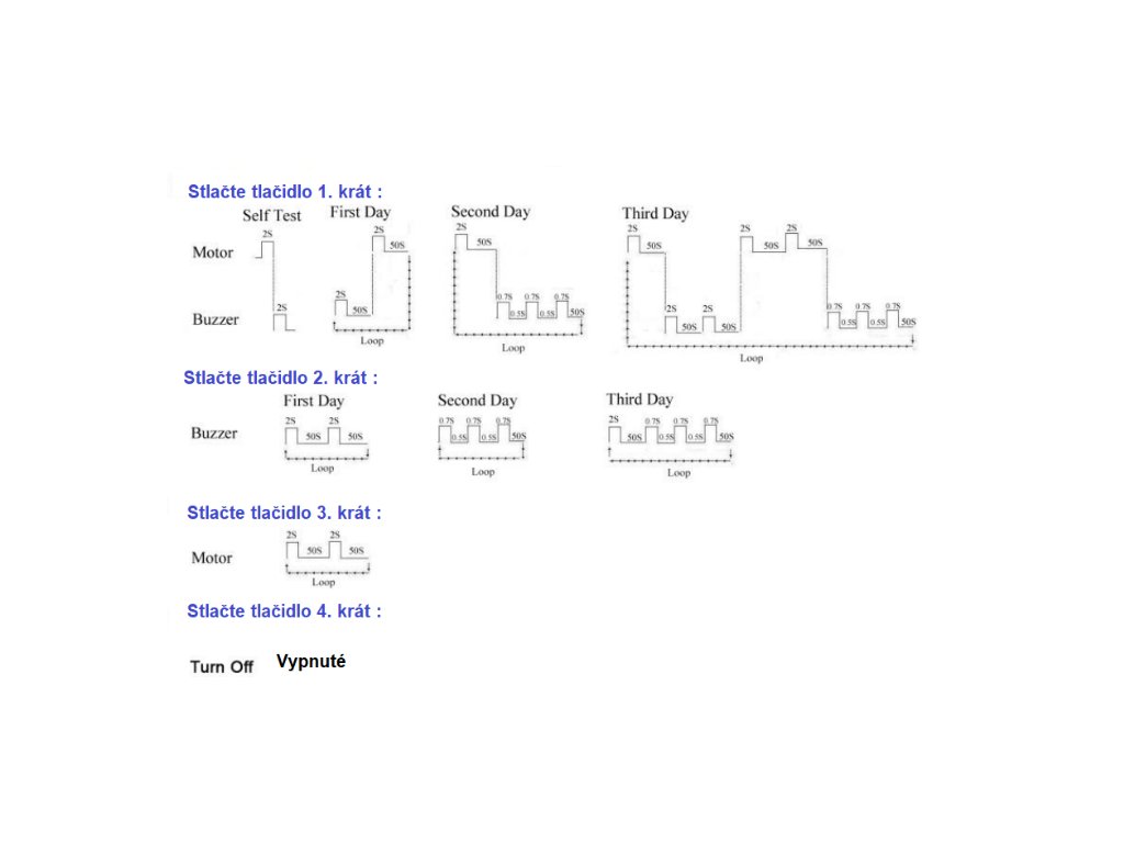 - Interval vibrací: 2 sekundy zapnuto / 50 sekund vypnuto