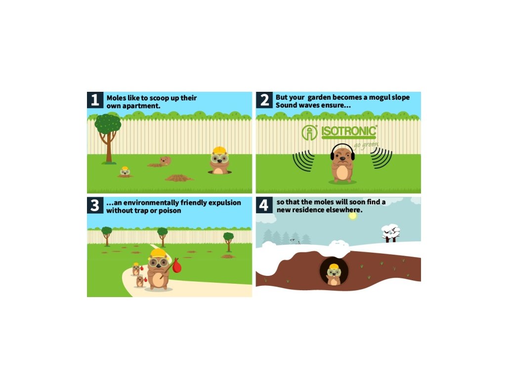 Krtci, hraboši a jiní podzemní škůdci mohou způsobit značné škody na trávníku, zahradě nebo na poli. Solární odpuzovač ISOTRONIC představuje ekologický a bezpečný způsob, jak je odradit – bez nutnosti použití jedů nebo pastí. Vydává nízkofrekvenční vibrace, které narušují přirozené chování škůdců a donutí je oblast opustit.