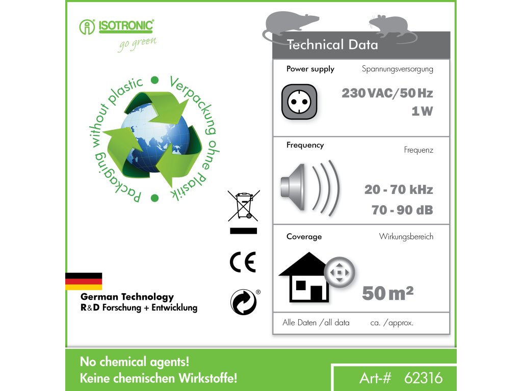 - Vydává vysokofrekvenční ultrazvuk, který působí rušivě na škůdce, ale není slyšitelný pro člověka