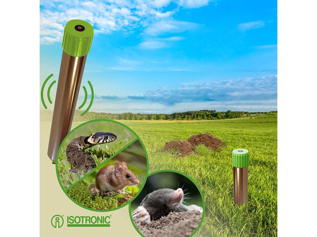 ISOTRONIC XXL Gold Finger je výkonný plašič pro venkovní použití, který spolehlivě odhání krtky, hraboše, hady a hmyz prostřednictvím ultrazvuku a vibrací. Pokrývá plochu až 1250 m² a funguje ekologicky – bez jedů, chemikálií nebo pasti. Ideální pro zahrady, pole a další venkovní plochy, kde chrání před škodami způsobenými podzemními zvířaty.