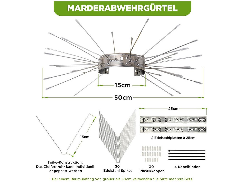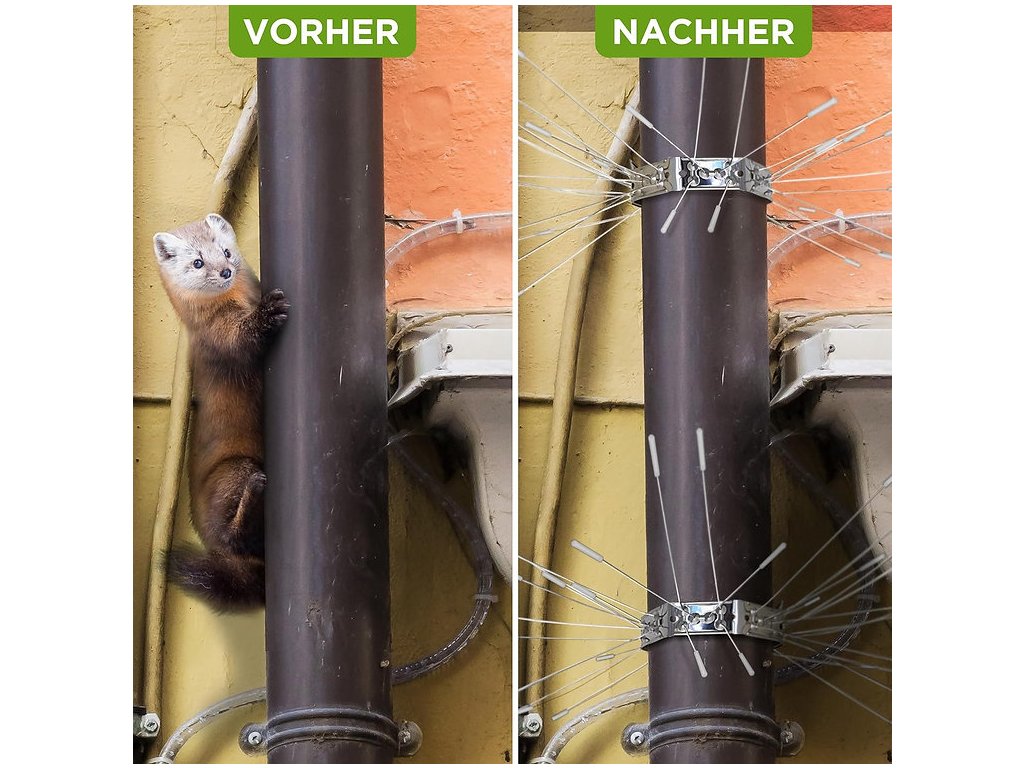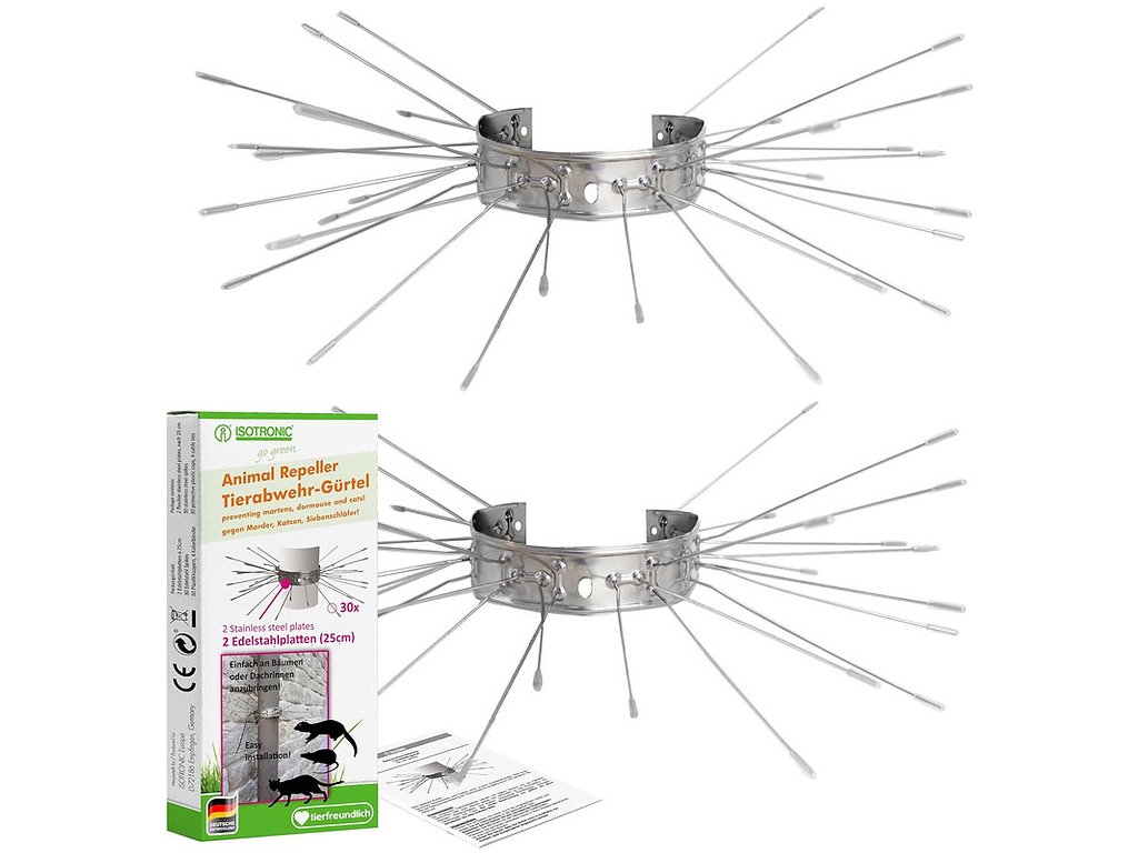 Kovový ochranný pás ISOTRONIC je mechanická zábrana, která spolehlivě zabrání kunám, plchům i kočkám vyšplhat se do podkroví, na střechu či k voliérám. Pás tvoří nerezové, flexibilní segmenty s hroty, které okolo stromu, trubky nebo sloupu vytvářejí nepřekonatelný kruh. Hroty mají plastové krytky, díky nimž je produkt bezpečný, ale stále vysoce účinný.