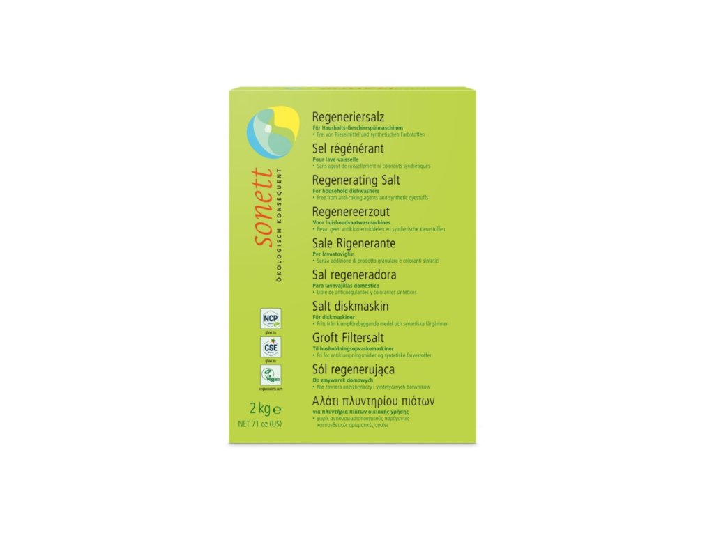 - SONETT Regenerační sůl do myčky nádobí, jako koncentrovaný roztok v solném zásobníku myčky, zajišťuje výměnu vázaných iontů vápníku a hořčíku za ionty sodíku z regenerační soli