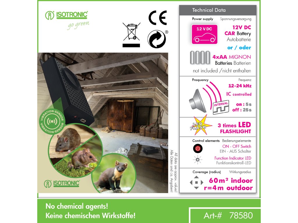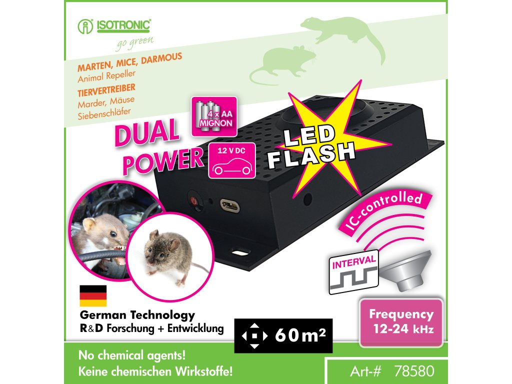 ISOTRONIC duální plašič kun a hlodavců je efektivní zařízení, které vydává vysokofrekvenční zvuk o frekvenci 12 kHz. Tento signál je nepříjemný pro škůdce, ale neškodný a neslyšitelný pro lidi. Díky možnosti napájení buď 4× AA bateriemi, nebo přímým připojením na 12V autobaterii, je ideální pro použití ve vozidle, garáži, půdě, sklepě či jiných vnitřních prostorách.