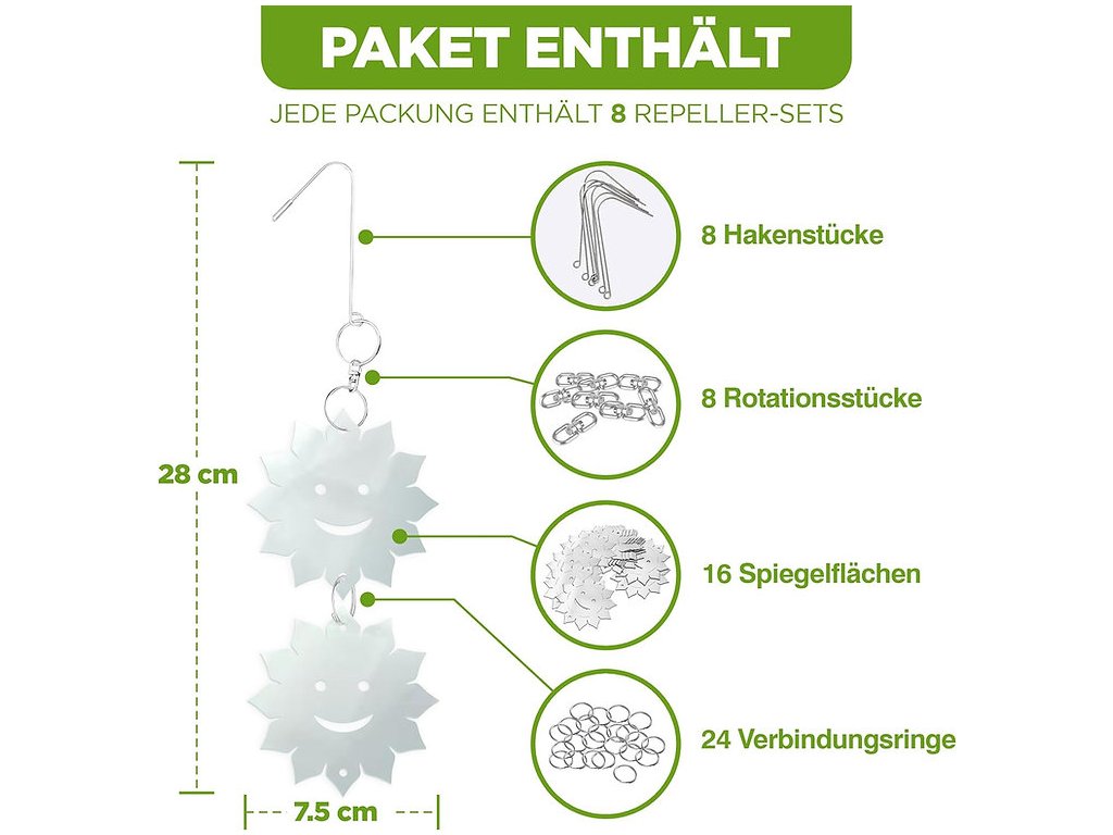 ISOTRONIC Odpuzovač ptáků - zrcadlové slunce - spolehlivá a ekologická ochrana venkovních prostor. Ptáci mohou způsobovat nepříjemnosti v zahradách, na balkonech či terasách, kde poškozují úrodu nebo znečišťují okolí. ISOTRONIC odpuzovač ptáků nabízí efektivní řešení, které pomáhá udržet tyto prostory čisté a chráněné. Díky oboustranným zrcadlovým kotoučům na řetězu vytváří neustále se měnící světelné odrazy, které ptáky považují za hrozbu a vyhýbají se jim.