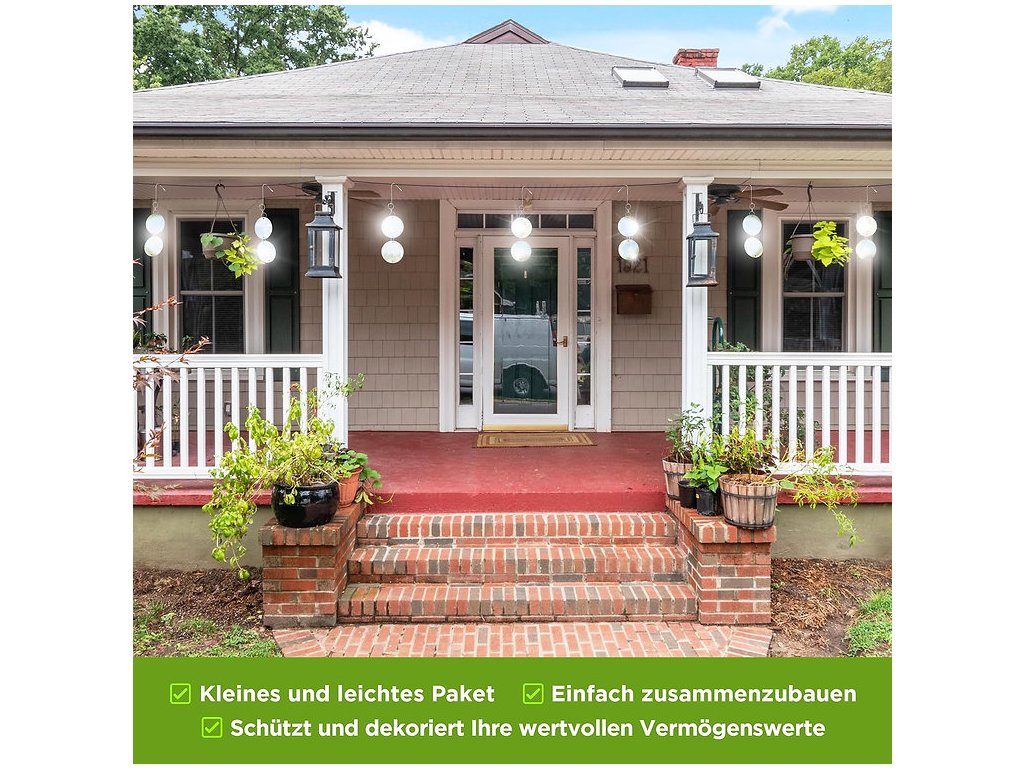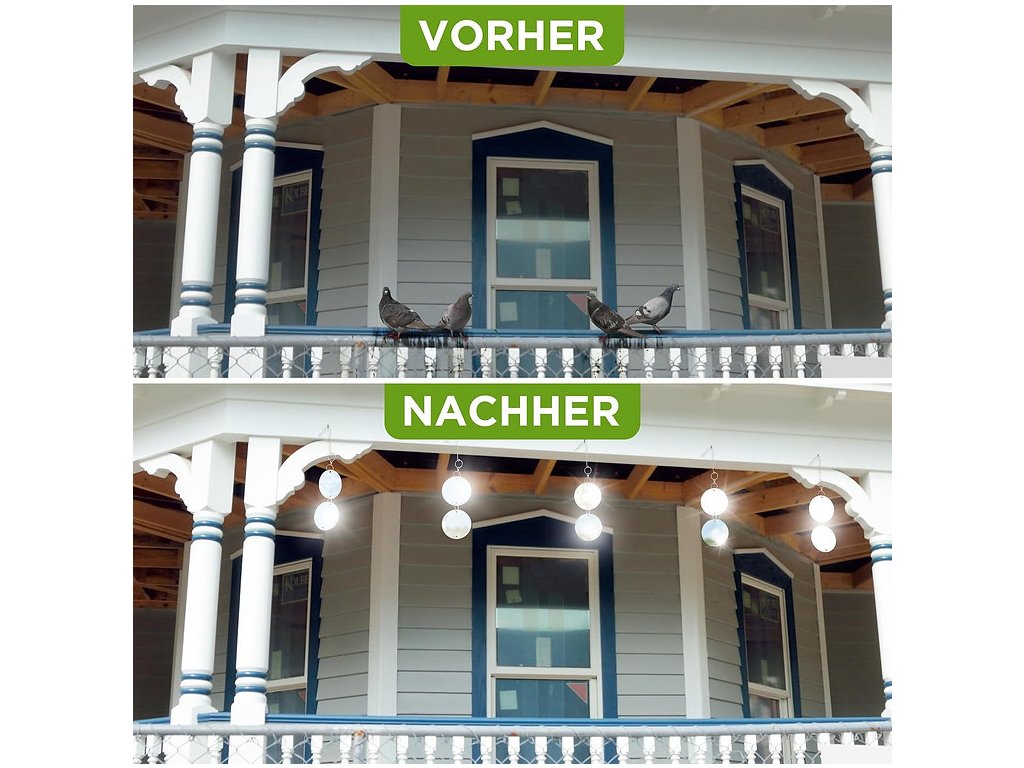 Kromě své vysoké účinnosti se odpuzovač vyznačuje také jednoduchou instalací. Řetězová konstrukce umožňuje snadné upevnění na různá místa, jako jsou stromy, pergoly, balkony či okraje střech. Jelikož kotouče ve větru přirozeně kmitají, jejich účinnost se ještě více zvyšuje. Navíc díky odolným materiálům zůstává funkční i v náročných povětrnostních podmínkách.