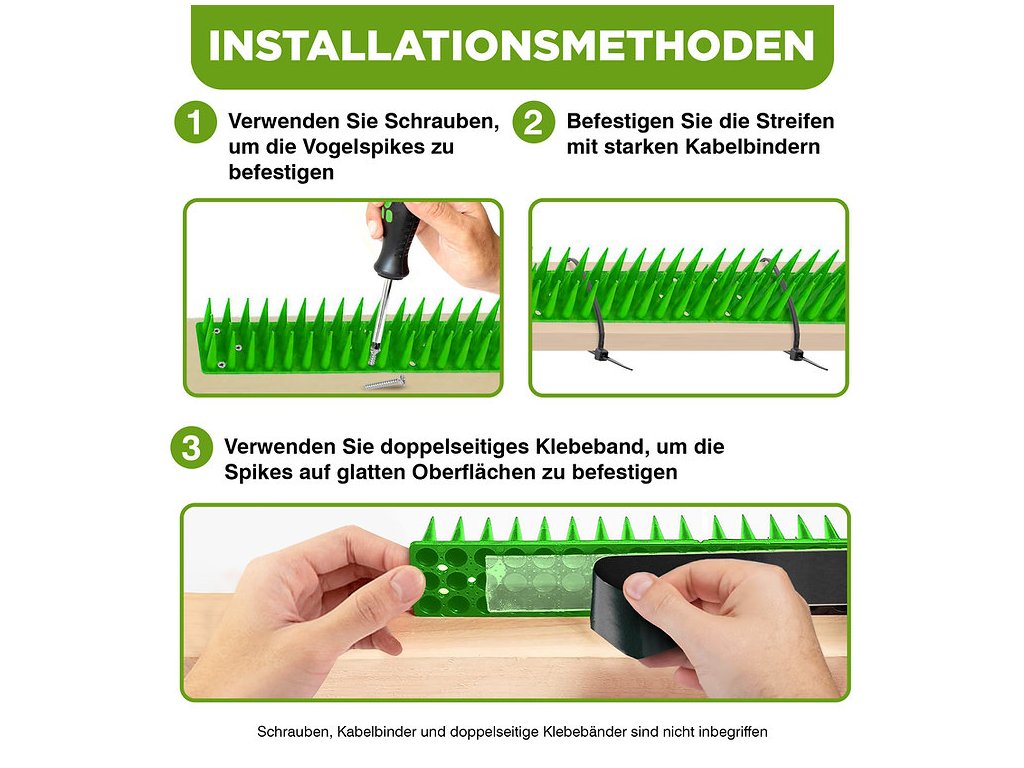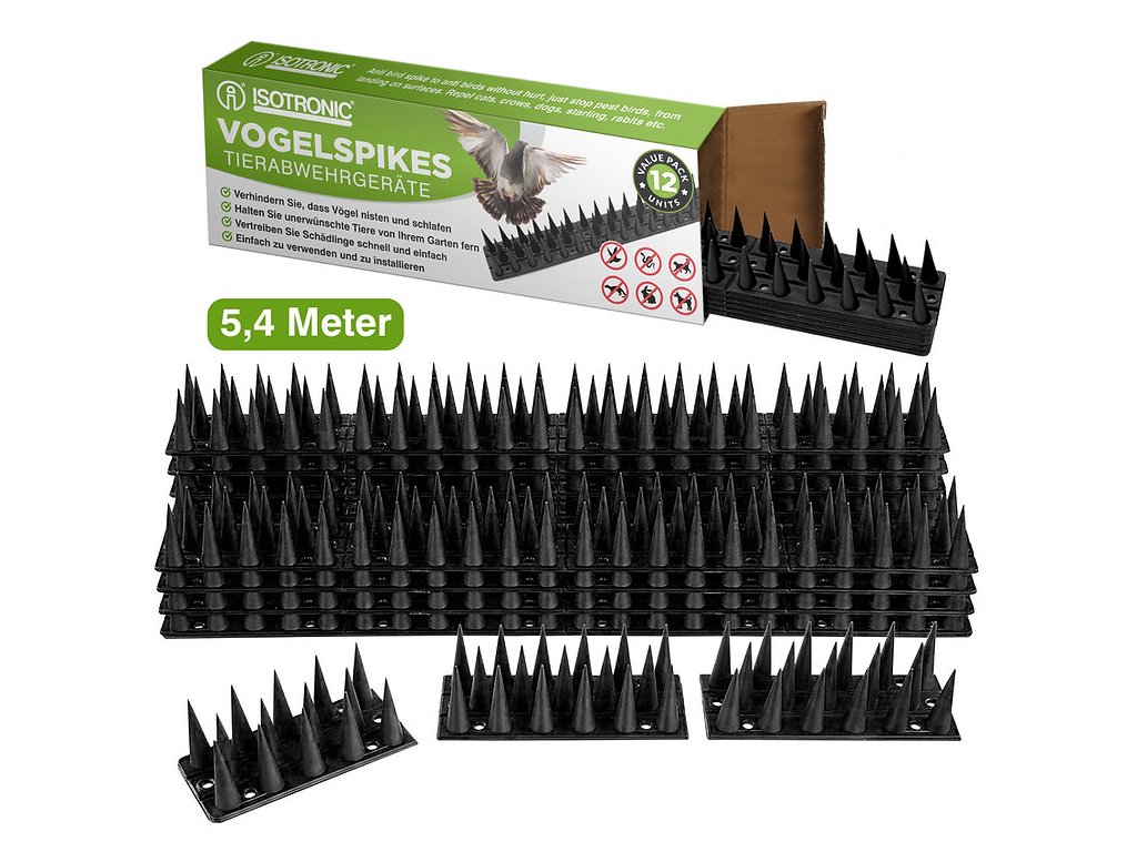 Instalace je rychlá a jednoduchá. Hroty se prodávají v modulech o délce 43 cm a balení obsahuje 12 kusů, což umožňuje pokrytí plochy 5,4 metru. Stačí je upevnit pomocí lepidla nebo šroubů na parapety, římsy, střechy, klimatizační jednotky či jiné povrchy. Při montáži je důležité ponechat jednotlivé moduly bez mezer, aby se zabránilo ptákům v přistání.