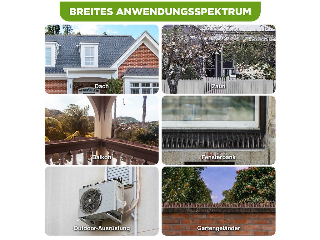 Holubi a jiní ptáci mohou znečišťovat fasády, balkony a parapety, což vede k nepořádku a poškození povrchů. Plastové ochranné hroty zabrání ptákům v přistání a hnízdění na nechtěných místech. Kromě ptactva odrazují také kuny, veverky či toulavé kočky, čímž snižují riziko poškození budovy.